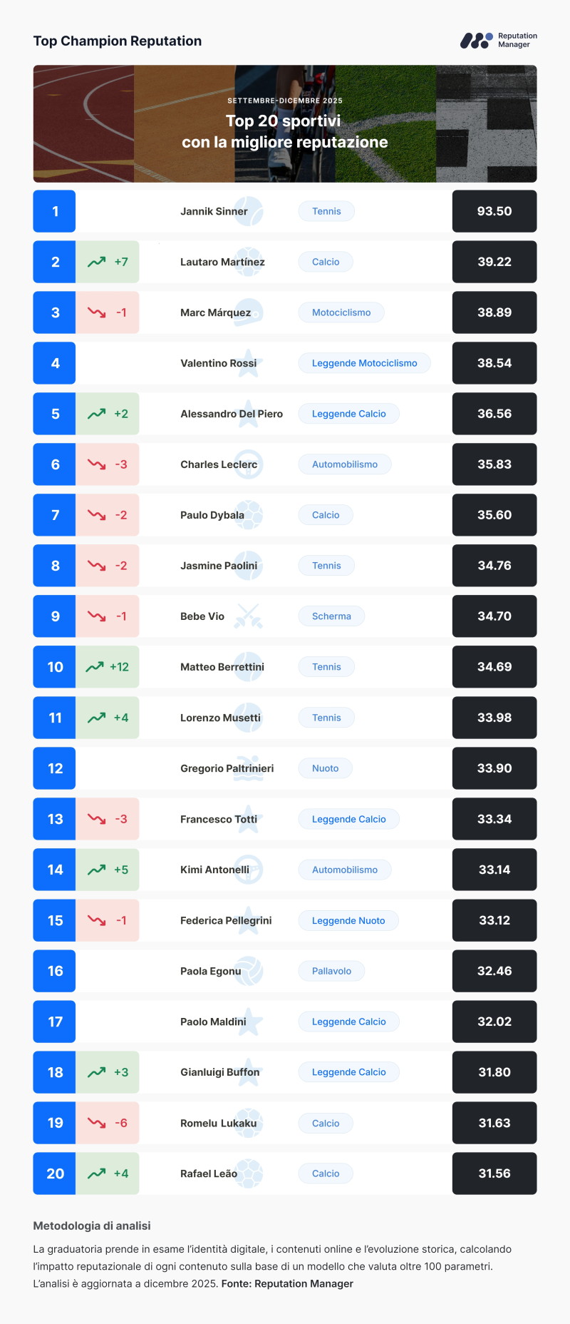 La nuova edizione di Top Champion Reputation, a cura di Reputation Manager®, fotografa la reputazione online dei principali sportivi in Italia nel periodo 15 settembre-15 dicembre 2025, attraverso il monitoraggio di social, stampa online e siti d’informazione su un paniere di oltre 160 atleti (tra attivi e leggende).